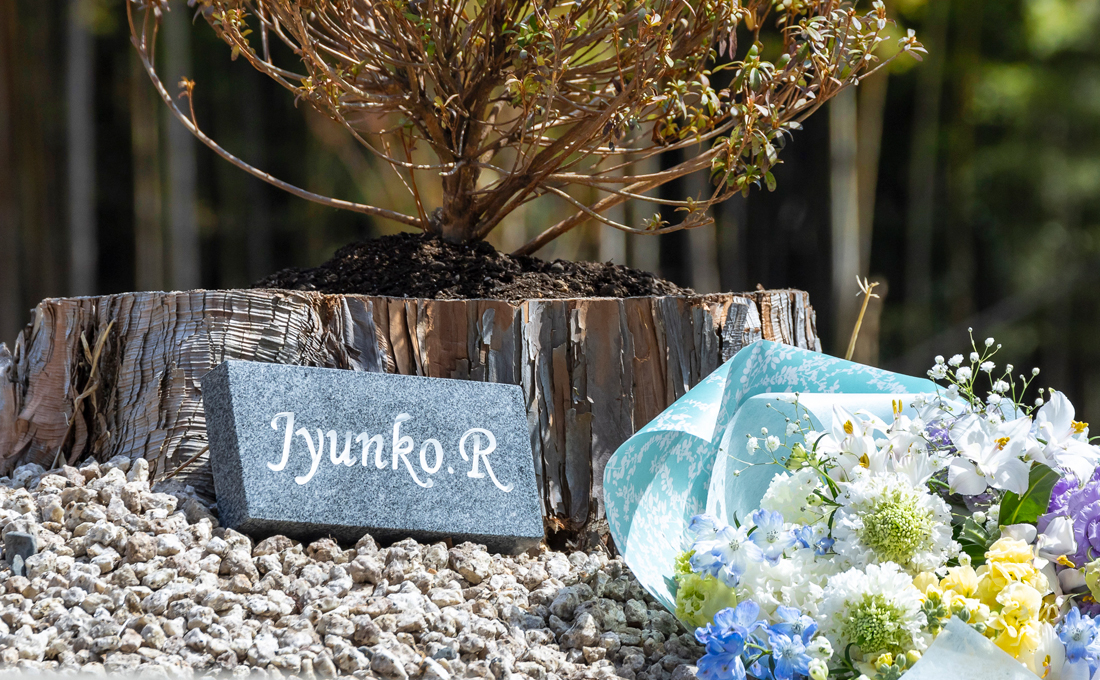 ご供養地「鱗-りん-」の敷地内にある木株に加工を施し、パウダー化したお骨を散骨。さらに樹木を植えてご供養します。樹木は墓標となり、訪れるたびに成長していく様子を見ることができます。